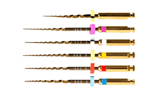 Guldfärgade maskinella roterande rotkanalsfilar av värmebehandlad nickeltitan.