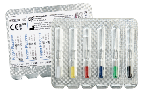 Fingerplugger av rostfritt stål med plastskaft för vertikal effektiv och exakt kondensering av guttaperka.