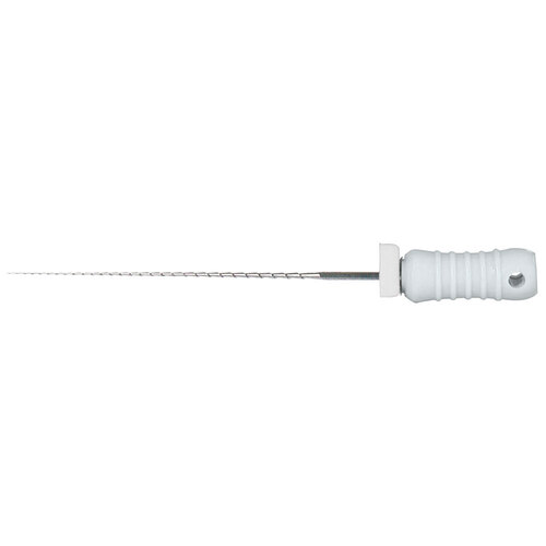 Steril rotkanalsfil enligt Hedström av rostfritt stål med filstopp och färgkodat skaft.