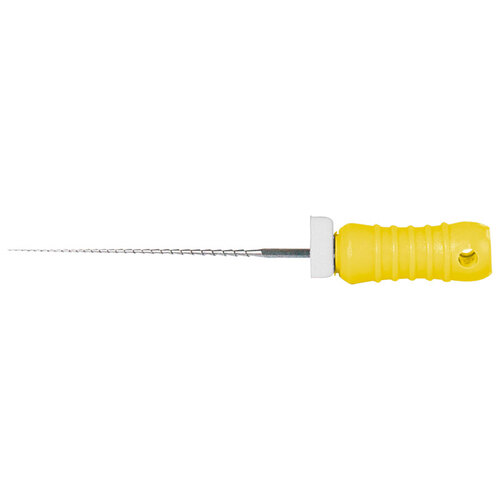 Steril rotkanalsfil enligt Hedström av rostfritt stål med filstopp och färgkodat skaft.