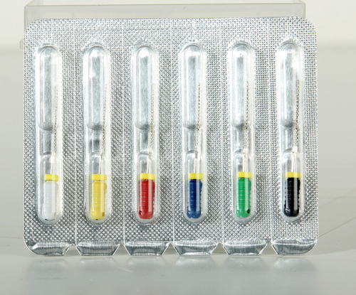 Steril K-fil av rostfritt stål med filstopp och färgkodat plastskaft.
