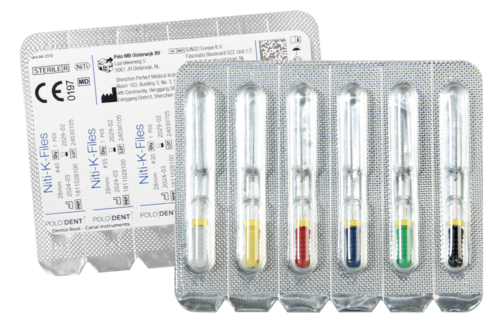 Steril K-fil av nickel titan med filstopp och färgkodat plastskaft.