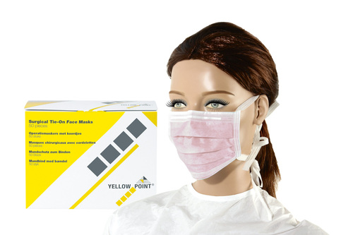 3-lagers operationsmunskydd med näsklämma och knytband. Lågt andningsmotstånd. Stänkbeständigt inre och yttre skikt, Stänkmotstånd 60 kPa, BFE ≥98%, andningsmotstånd ΔP <60,0 Pa/cm2.