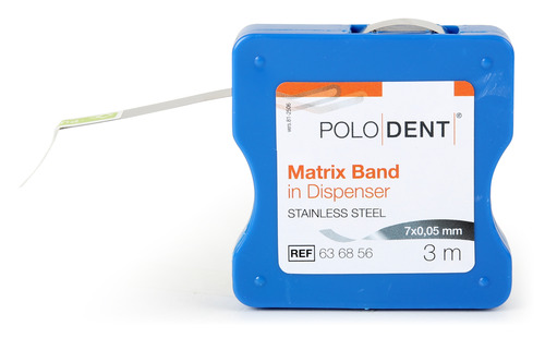 Matrisband i rostfritt stål på rulle, främst använd för framtänder. Levereras i praktisk dispenser