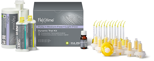 Förpackning: 1x380 ml Dynamix Putty, 10 st Dynamix Mixing Tips, 1 st Dynamix Fixation Ring, 1x50 ml Light Flow, 1x50 ml Medium Flow, 12 st Mixing Tips yellow, 12 st Intraoral Tips yellow, 1x10 ml Universal Adhesive.