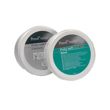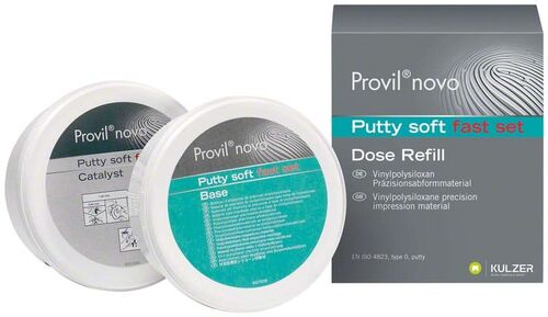 Provil novo Putty Soft Fast set är ett mjukt A-silikon skedmaterial i kombination med ett washmaterial, knådbart och snabbstelnande. Material för korrekturavtryck, skedmaterial för sandwichavtryck, funktionsavtryck. För användning tillsammans med Provil sprutmaterial.