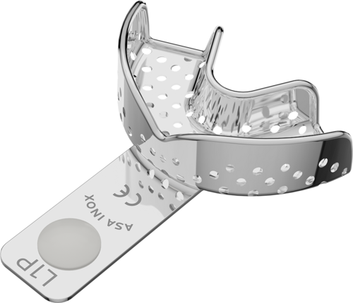 Rostfri perforerad avtryckssked med retentionskant för underkäke. Mått: