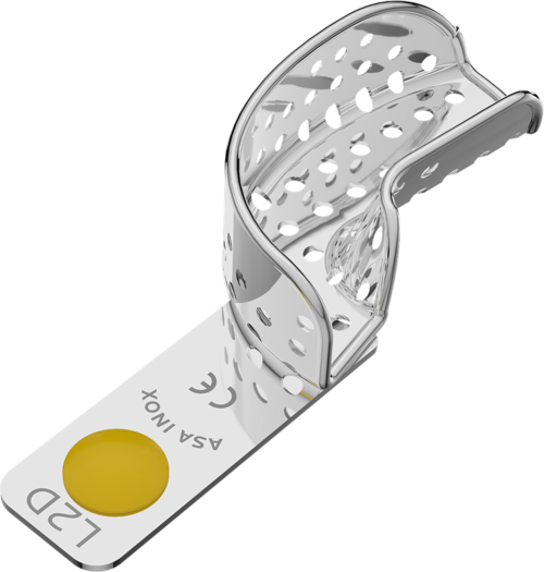Rostfri perforerad avtryckssked med retentionskant för överkäke. Mått: