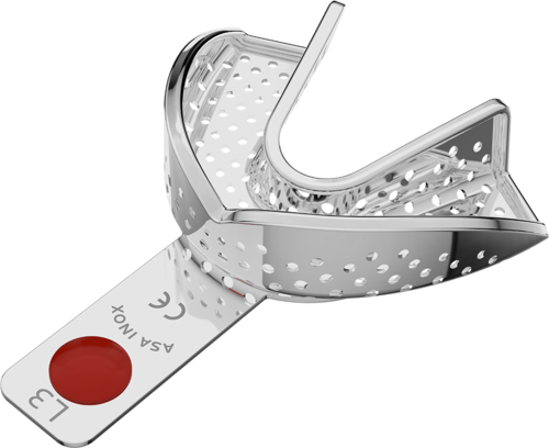 Rostfri perforerad avtryckssked med retentionskant för underkäke. Storlek: Small. Röd färgkodning.