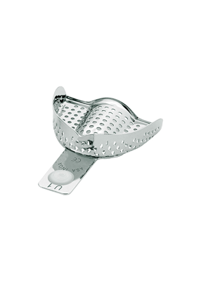 Rostfri perforerad avtryckssked utan retentionskant för överkäke.