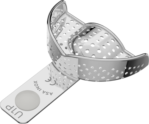 Rostfri perforerad avtryckssked med retentionskant för överkäke. Mått: