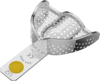 Rostfri perforerad avtryckssked med retentionskant för överkäke. Storlek:X-small. Gul färgkodning.