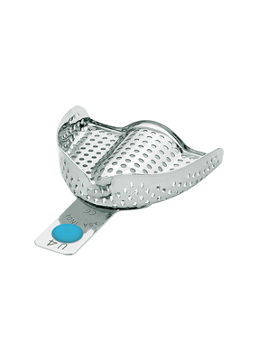 Rostfri perforerad avtryckssked utan retentionskant för överkäke.