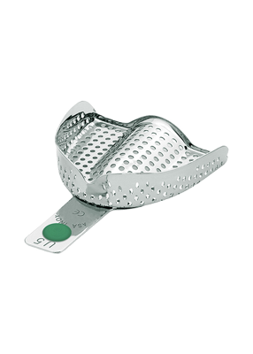 Rostfri perforerad avtryckssked utan retentionskant för överkäke.