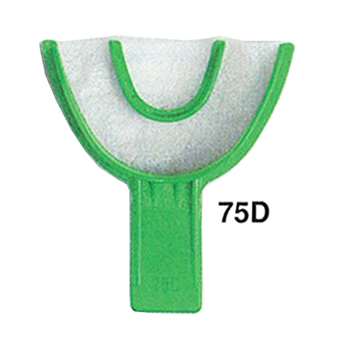 Engångssked av plast, trippelfunktionell check-bite-avtryckssked för att återskapa ett slutet bett. Smidigt mikrotunt nät på botten av skeden. Främre område 75D. Grön.