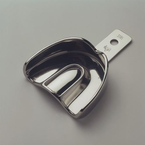 Solid avtryckssked av rostfritt stål för betandat bett i överkäke. Autoklaverbar. Storlek: Medium smal.