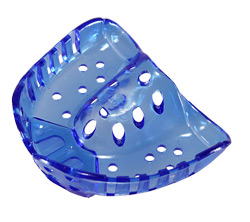 Perforerad avtryckssked för överkäke av blå plast, avtagbart handtag av metall.