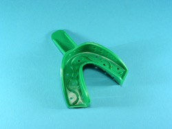 Grön engångssked, 20D, stor för underkäke. Tillverkad i styv plast vilket ger tillräcklig precision för flertalet indikationer. Har ett unikt sick-sack mönster i skeden vilket minimerar risken för kusp kontakt med skeden. Starkt inbyggt handtag för enkelt placerande och avlägsnande av avtryckskeden. Anatomisk design. Rimlockkanter låser kvar avtrycksmaterialet i skeden.