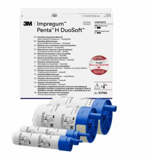 Skedmaterial Impregum Penta Duo Soft H (folieförp) som används i kombination med sprutmaterial Impregum Penta Duo Soft L (folieförp) eller Impregum Garant Duo Soft L (ampull 1:1).