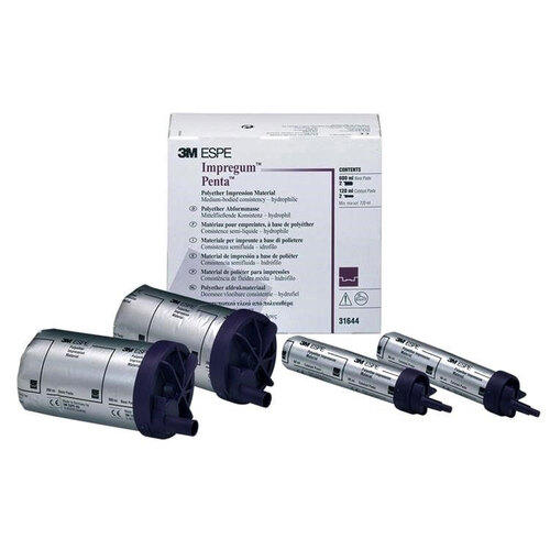 Impregum Penta Polyeter monofasmaterial med mellanviskositet, samma material i sked som spruta. Täcker alla protetiska indikationer. Rekommenderas speciellt vid implantatavtryck. Är den mest styva polyetern. Impregum Penta är tixotropiskt, dvs det flyter ut under tryck samt är dimensions stabilt. Mörk lila färg.