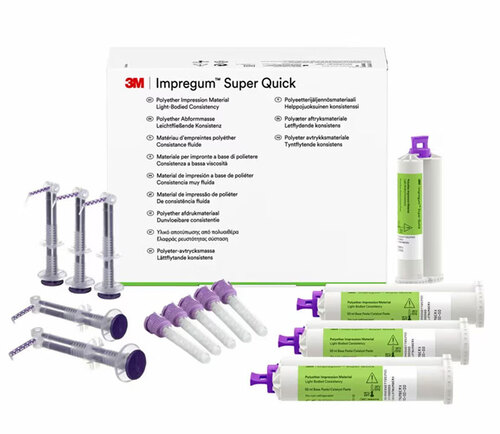 Impregum™ Super Quick Polyeter avtrycksmaterial. Den första supersnabba polyetern avsedd för snabbare högprecisionsavtryck i mindre komplexa fall. För monofas och 1-stegs avtrycksteknik . Går att scanna, med nuvarande scannrar på marknaden. Fräsch mintsmak. 45 sekunders arbetstid och 2 minuters stelningstid.