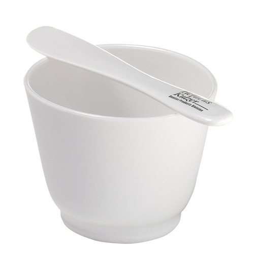 Blandningskopp i vit plast. Diameter 12 cm, höjd 9 cm.