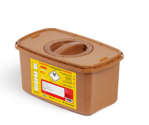 riskavfallskärl med dubbellock. Miljövänlig kanylburk i träkomposit för minskat CO2 utsläpp med 66%