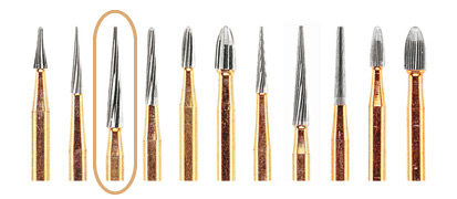 Lång konisk guldfärgad 12 bladigt finisheringsborr för konturering och finishering för FG-fattning. ISO nr - 014.