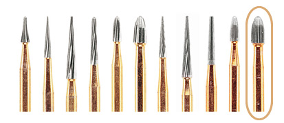 Guldfärgad äggformad 30 bladigt finisheringsborr för konturering och finishering med FG-fattning.