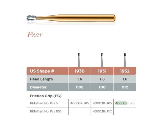 Finbladigt specialborr för guld och amalgam, längd arbetsdel 1,6 mm.