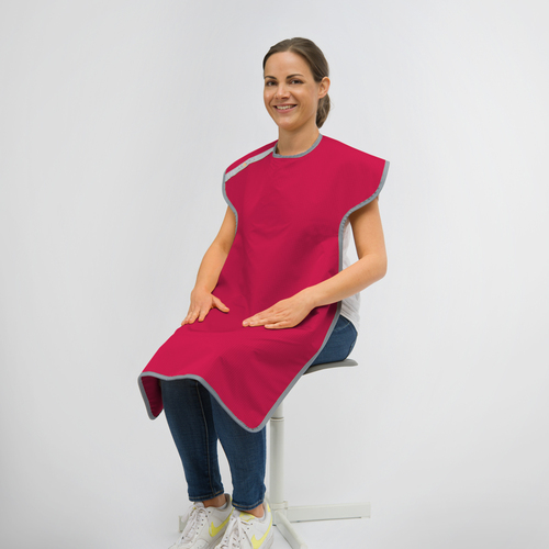 Vändbart tvåfärgat röntgenskyddsförkläde utan krage för sittande patient. Av flexibelt blygummi med yta i Comfor-tex, blyekvivalens Pb 0,5 mm.