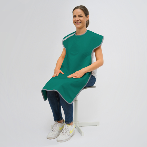 Röntgenskyddsförkläde utan krage för sittande patient. Bakknäppt förkläde av flexibelt blygummi med yta i Comfor-tex, blyekvivalens Pb 0,5 mm. Färg: Lagoon (grön).
