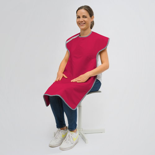 Röntgenskyddsförkläde utan krage för sittande patient. Bakknäppt förkläde av flexibelt blygummi med yta i Comfor-tex, blyekvivalens Pb 0,5 mm. Färg: Orchidee (rosaröd).