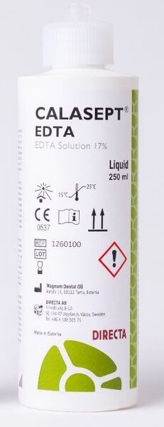 Användningen av Calasept EDTA minimerar filfrakturer och ger förbättrad vidhäftning till fyllnadsmaterial. Enkelt att spola bort ur kanalsystemet.