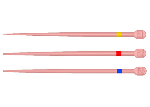 Sortimentsförpackning med färgkodade guttaperkaspetsar F1-F3 med variabel avsmalnande taper