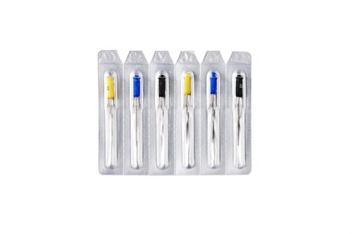 Stoppare av rostfritt stål med plastskaft för vertikal kondensering av guttaperka, har en trubbig platt spets och 2 % konicitet. Storlek:20-80. Längd: 25 mm. Sorterade.