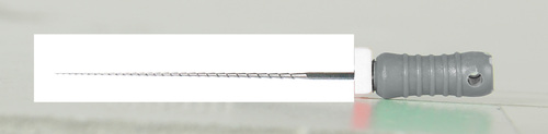 Steril rotkanalsfil enligt Hedström av rostfritt stål med filstopp och färgkodat skaft.
