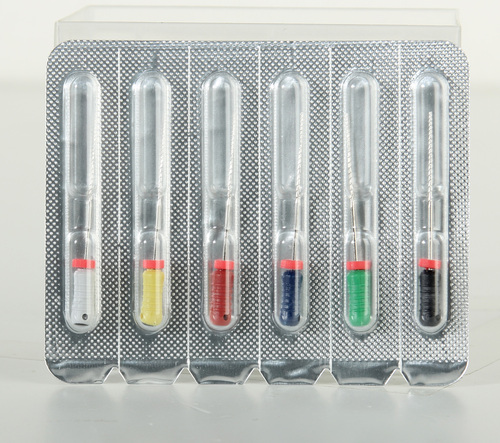 Sterila rotkanalsfilar enligt Hedström av rostfritt stål med filstopp och färgkodat skaft.