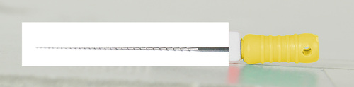 Steril rotkanalsfil enligt Hedström av rostfritt stål med filstopp och  färgkodat skaft.