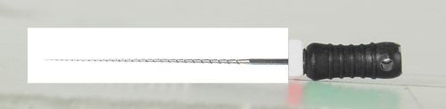 Steril rotkanalsfil enligt Hedström av rostfritt stål med filstopp och färgkodat skaft.