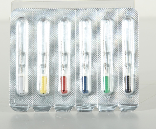 Steril K-fil av rostfritt stål med filstopp och färgkodat plastskaft.
