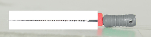 Steril K-fil av rostfritt stål med filstopp och färgkodat plastskaft.