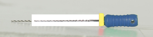Steril rotkanalsfil av rostfritt stål med filstopp och färgkodat skaft.