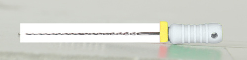 Steril rotkanalsfil av rostfritt stål med filstopp och färgkodat skaft.