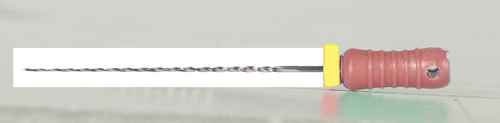 Steril rotkanalsfil av rostfritt stål med filstopp och färgkodat skaft.