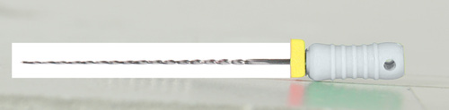 Steril rotkanalsfil av rostfritt stål med filstopp och färgkodat skaft.