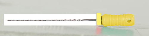Steril rotkanalsfil av rostfritt stål med filstopp och färgkodat skaft.