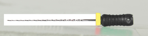 Steril rotkanalsfil av rostfritt stål med filstopp och färgkodat skaft.