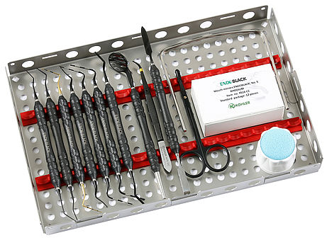 Innehåll:9200 Explorer DG169214 Explorer 17/17L (modifi ed)9212 Periodontal probe CP 12/CP159218 Mouth mirror handle4516-CC Mouth mirrors Rhodium, size 5 (Ø 24 mm), black frame, packing unit: 12 pcs.4075-CC Pliers PERRY4689 Rubberdam frame6980 IRIS MAGICUT® scissors, straight9210 Excavator 32L9207 Plugger 1/2 (060/080)9208 Plugger 3/4 (100/120)9213 Filling spatula HEIDEMANN 19219 Spatula with endo ruler9222 Endo files stand7609-RO Sterilisation tray