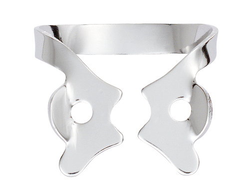 Placera kofferdam, klammer ram samtidigt. Kofferdammen sträcks under klammerns vingar.